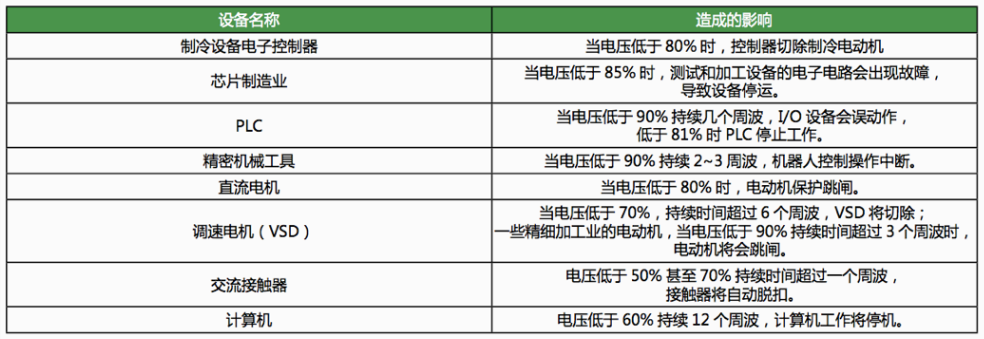 The harm caused by voltage sag is related to industry nature and load. The following table shows the voltage sensitivity of some devices: